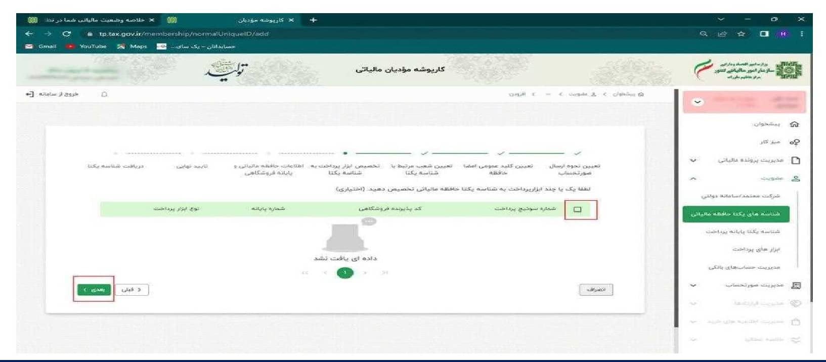 ۱۱- درقسمت بعدی بایستی اطلاعات حافظه مالیاتی و پایانه فروشگاهی خود را درج نماییدو گزینه بعدی را انتخاب کنید.