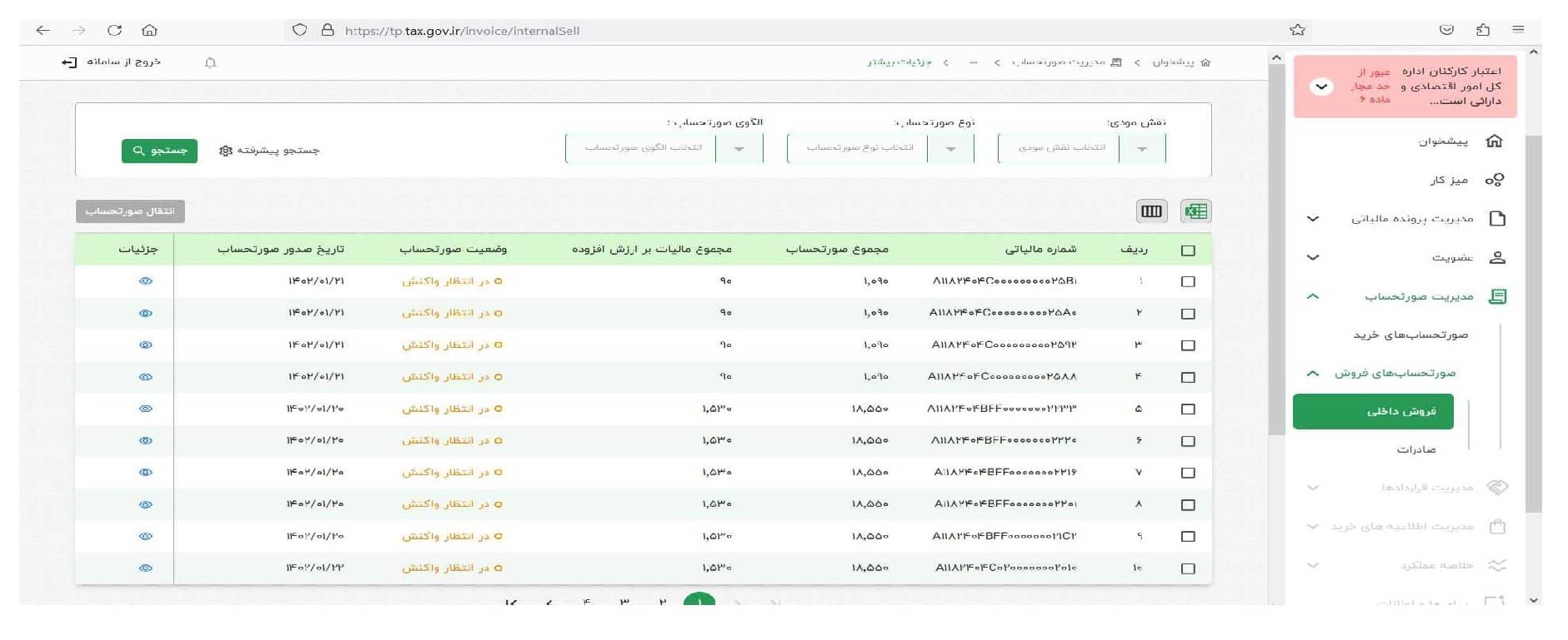 دراین قسمت پس از ورود به کارپوشه از منوی مدیریت صورتحساب با توجه به نوع صورتحساب ( خرید – فروش و صادرات ) اطلاعات درج شده در کارپوشه را کنترل نمایید.